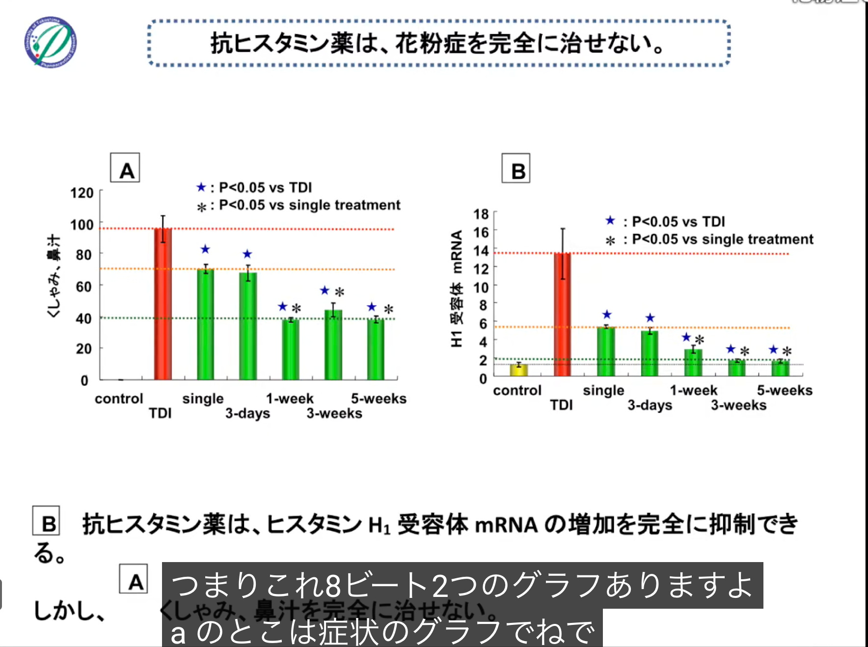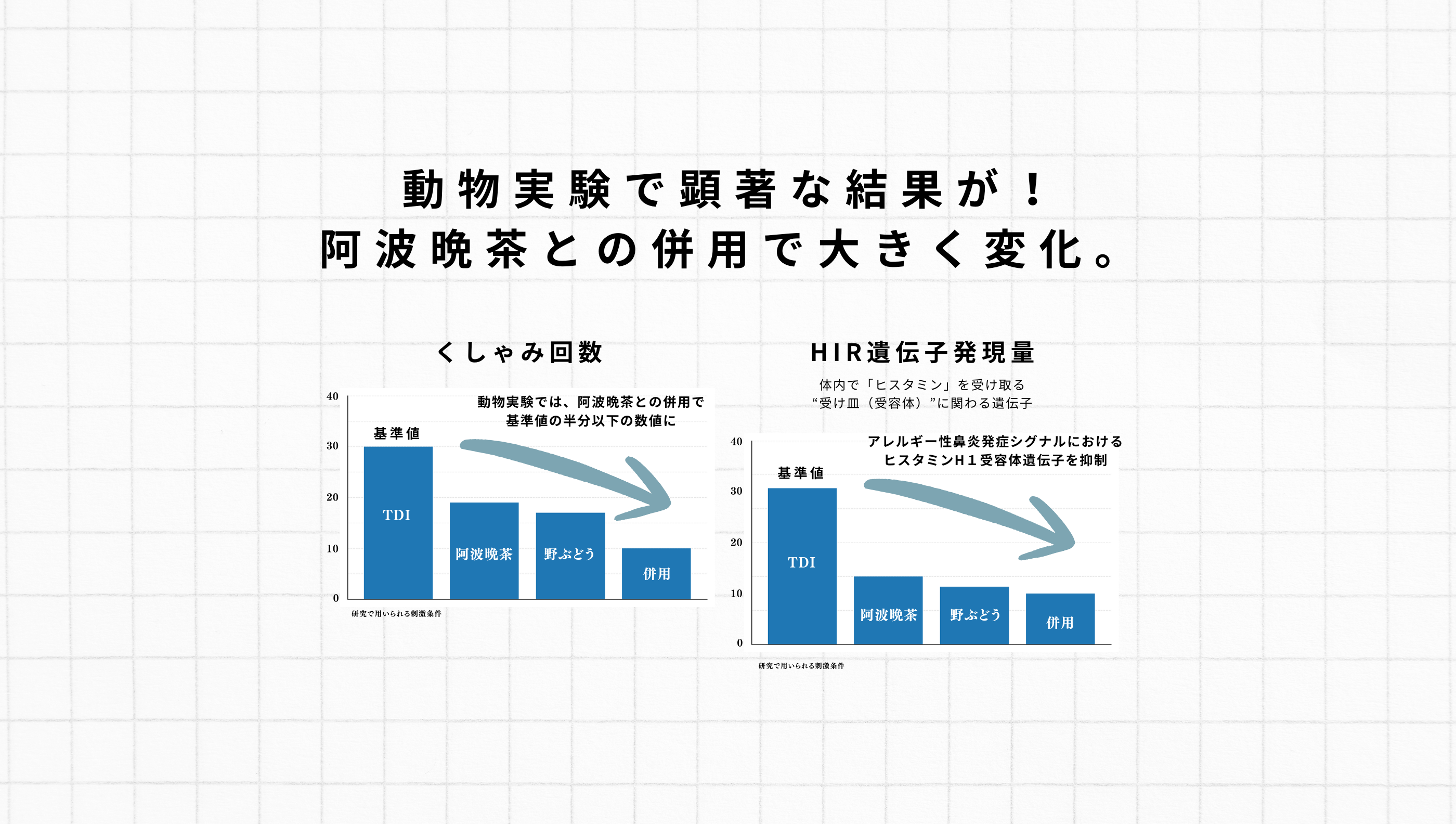 さらに動物試験において、「くしゃみ回数」と「HIR遺伝子発現量(体内で「ヒスタミン」を受け取る“受け皿(受容体)”に関わる遺伝子)」という2つの指標を比較した参考データです。