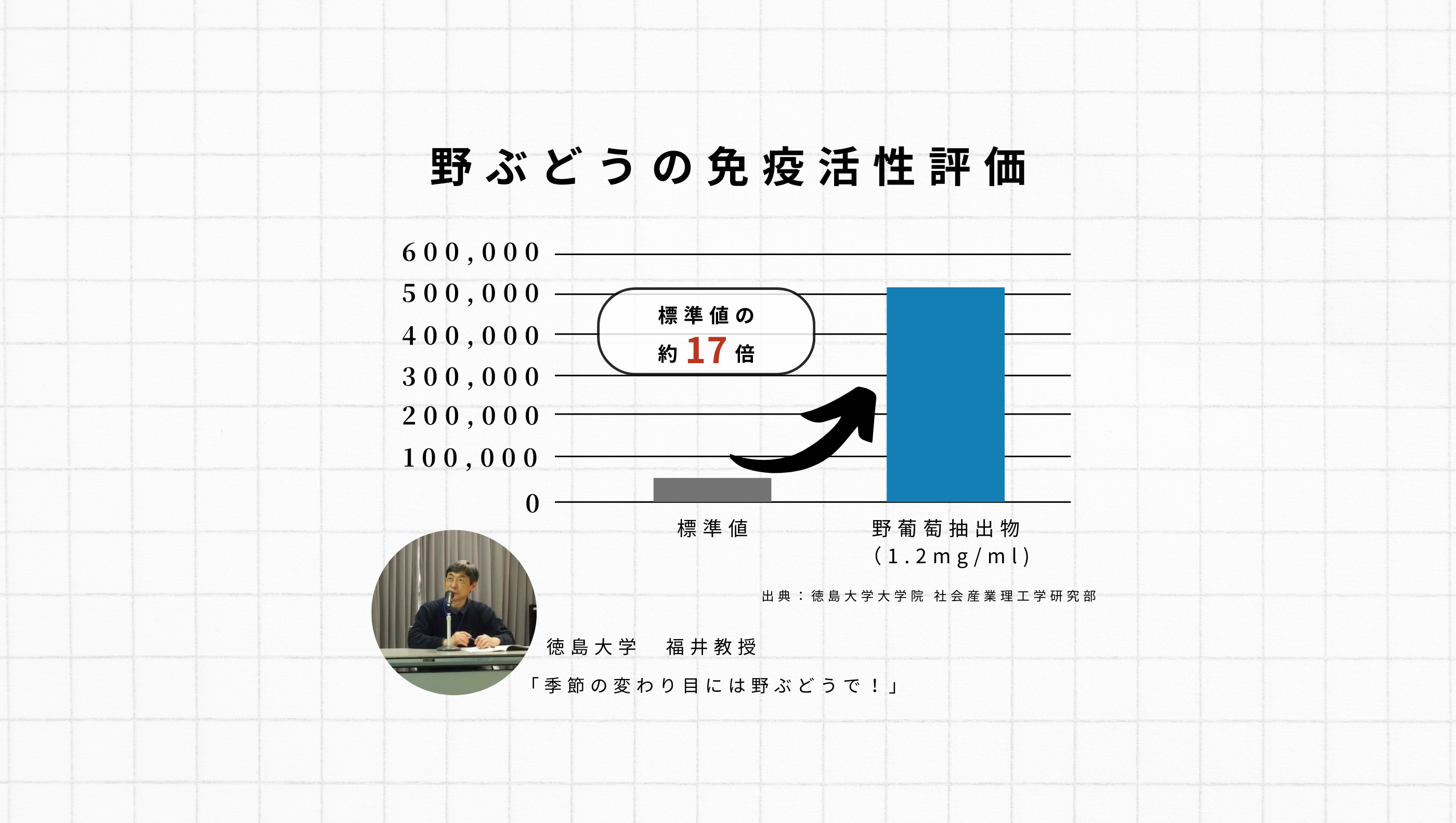 実験では、熱処理した野ぶどうパウダーを水に溶かして、免疫活性を測ったところ標準値の約17倍の違いを確認しました。